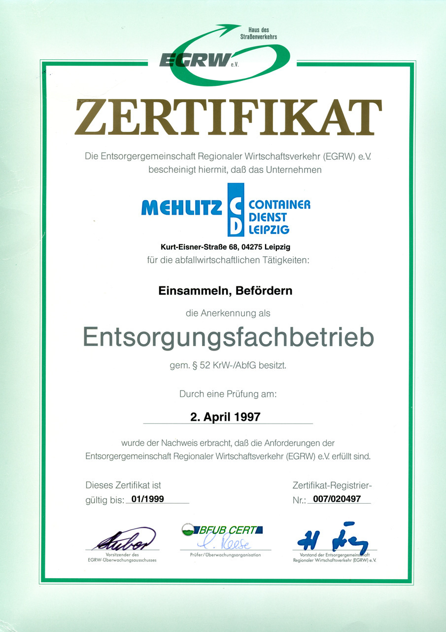 Die Entsorgergemeinschaft Regionaler Wirtschaftsverkehr (EGRW) e.V. ist bundesweit für die Zertifizierung zum Entsorgungsfachbetrieb für sämtliche abfallwirtschaftlichen Tätigkeiten behördlich anerkannt.